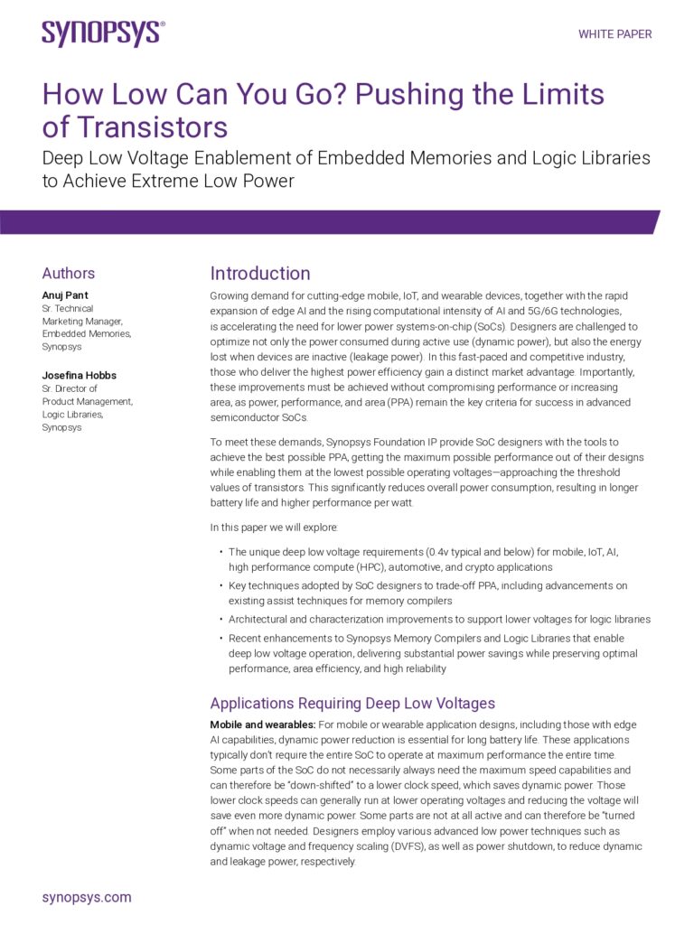 The accelerating growth of mobile devices, IoT products, wearables, and AI‑driven systems is increasing demand for chips that deliver high performance with far lower power consumption. One of the most effective techniques for reducing active and standby power in modern systems‑on‑chip (SoCs) is lowering transistor operating voltage. Synopsys Foundation IP enables this by helping designers achieve strong power, performance, and area (PPA) efficiency at extremely low voltages, resulting in longer battery life and improved energy efficiency.