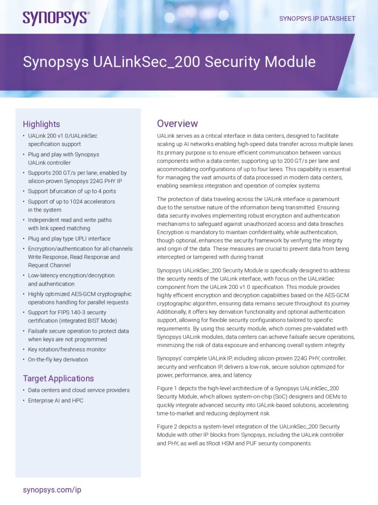 The Synopsys UALinkSec_200 Security Module is designed to protect high-speed data transfers in modern data centers. UALink enables fast communication between system components, supporting up to 200 GT/s per lane across multiple lanes. Because large volumes of sensitive data move through these links, strong encryption and authentication are essential to prevent unauthorized access or data tampering.